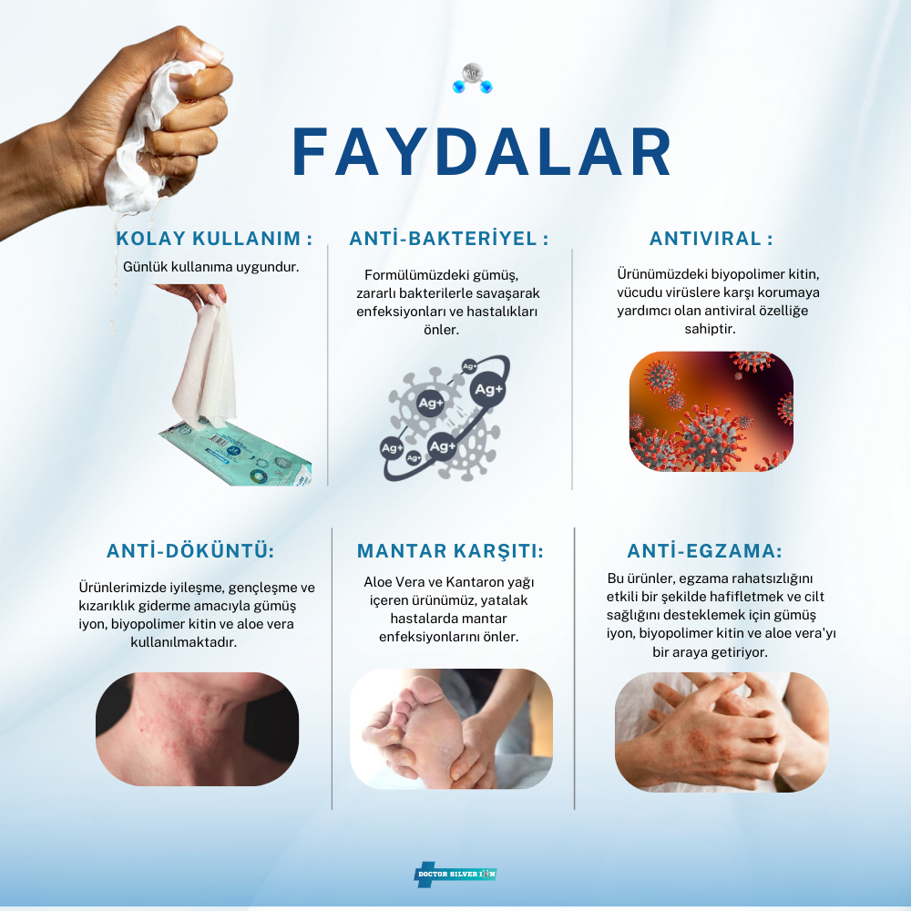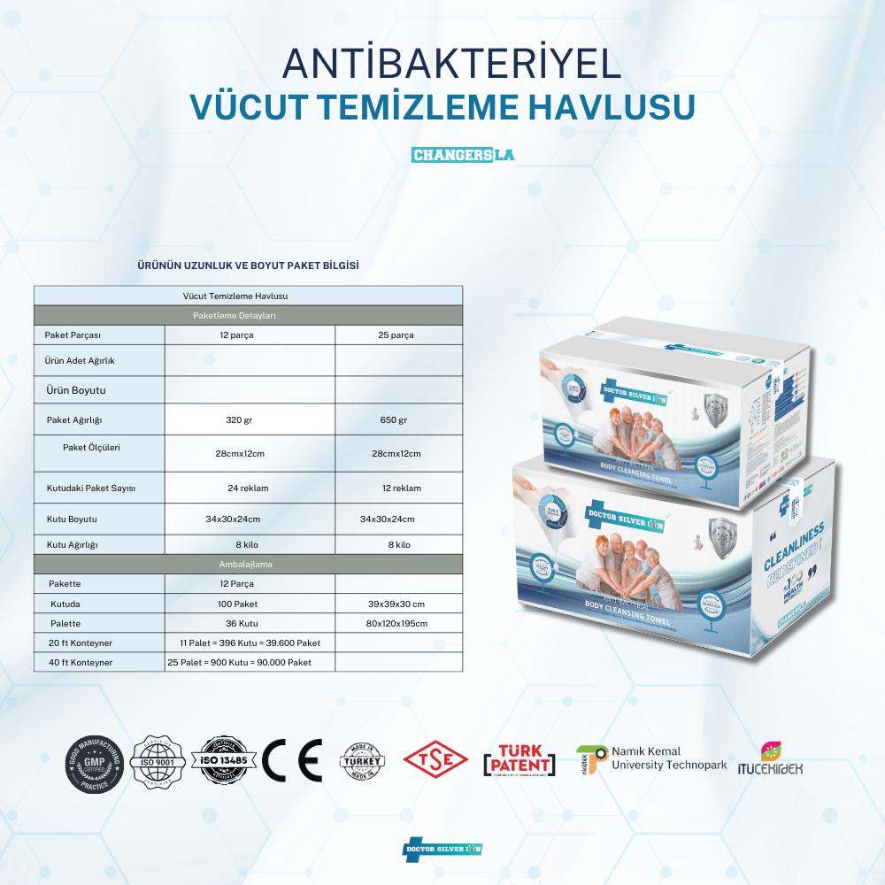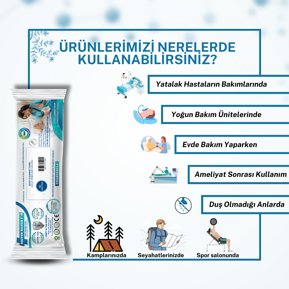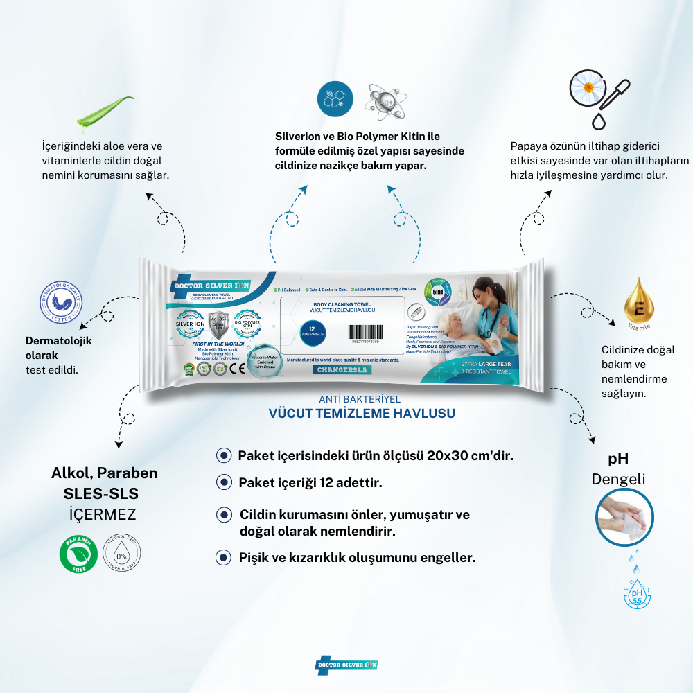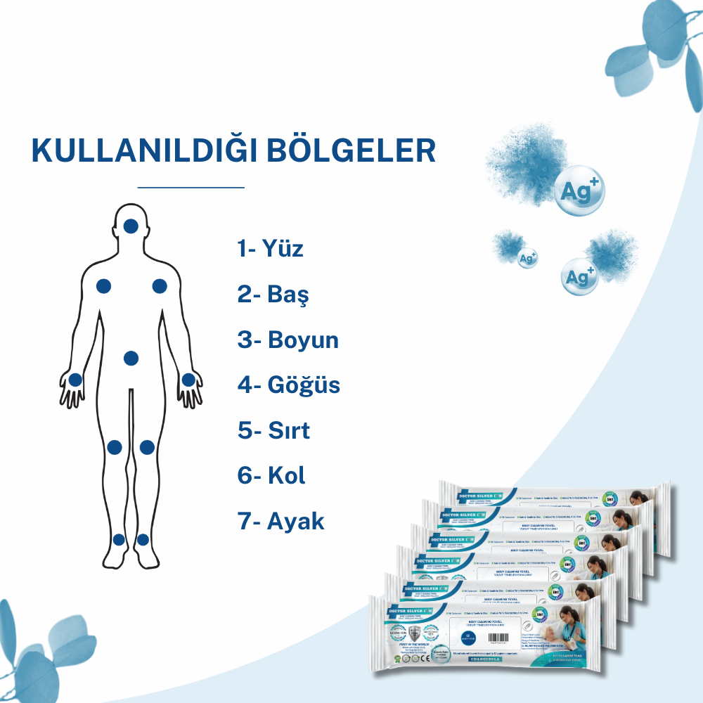 Doctor Silver Ion Vücut Temizleme Mendilleri, su kullanımı gerektirmeyen, günlük vücut bakımı ihtiyacını karşılayan, eksiksiz, hijyenik ve nazik bir temizlik çözümü sunmak için özel olarak formüle edilmiştir.